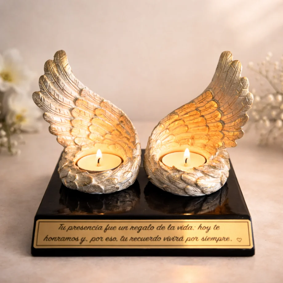 Este recordatorio con alas de ángel y doble vela simboliza protección, unión y luz eterna. Su elegante base de madera con placa dorada personalizada lo convierte en una pieza especial para honrar la memoria de un ser querido con paz, amor y esperanza.